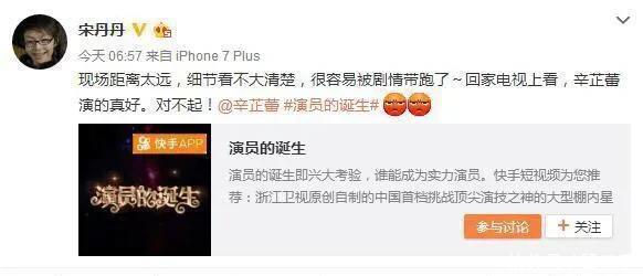 比赛的结果自然是舒畅赢了,但是宋丹丹发的微博里好像揭示了自己当评委的无可奈何以及对辛芷蕾的惋惜,她说:近看辛芷蕾的微表情管理做得更好,演技更为出色,对不起。辛芷蕾自然借水推舟,回答了一句:谢谢老师的肯定和鼓励。